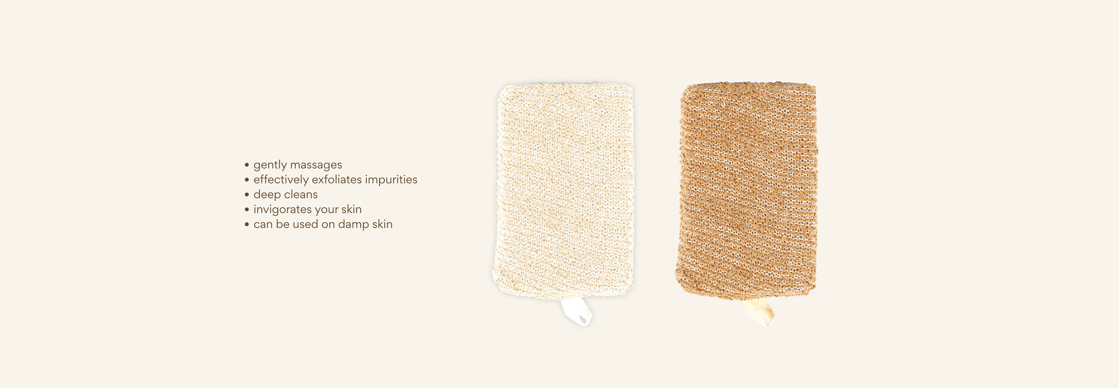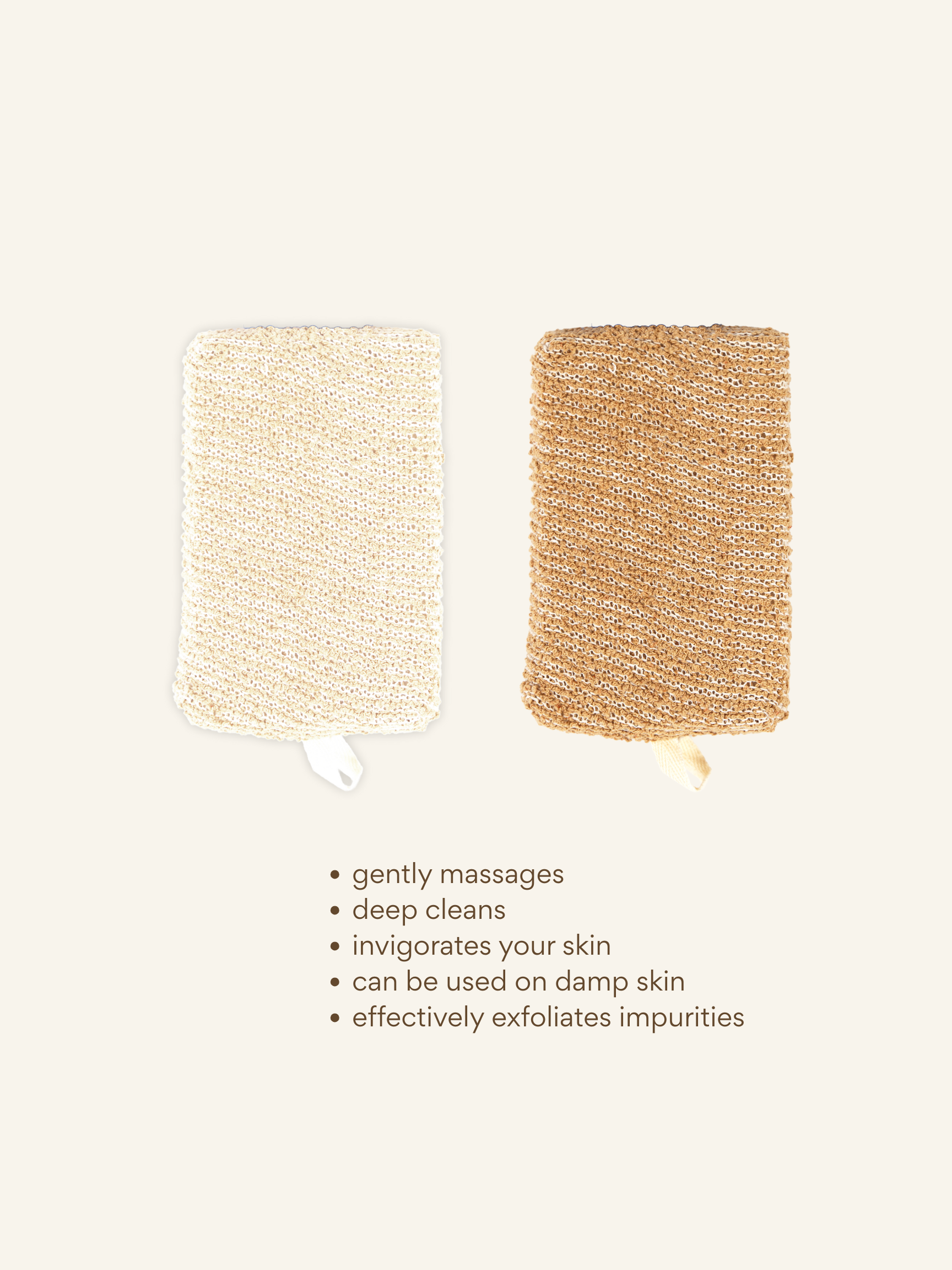 This 2-pack of square sponges is crafted from natural fibers to gently exfoliate and cleanse. The beige and brown tones bring a grounded aesthetic while offering an eco-conscious alternative for daily shower care.